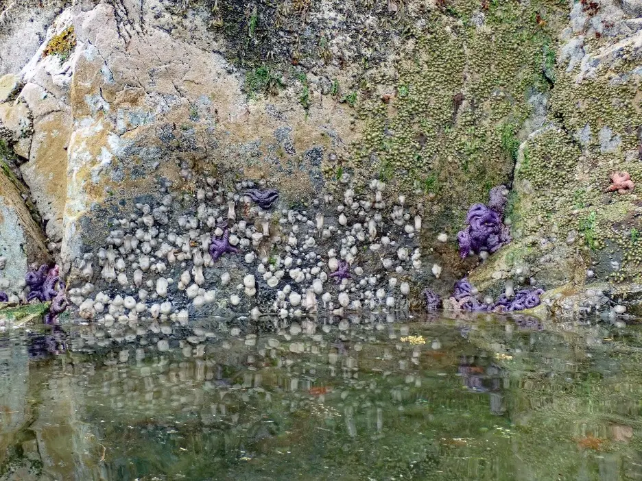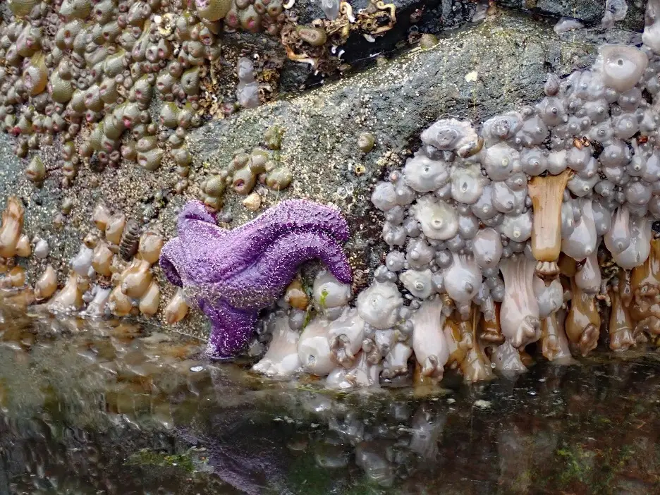 Clusters of Sea Stars (purple), various Sea Anemone, and a single ochre-coloured Sea Star above the Water at low tide