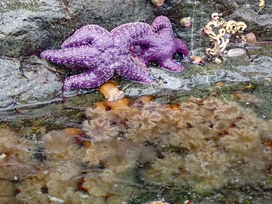 Ochre Sea Star Cluster (purple), and Plumose Anemone (below the water) at low tide