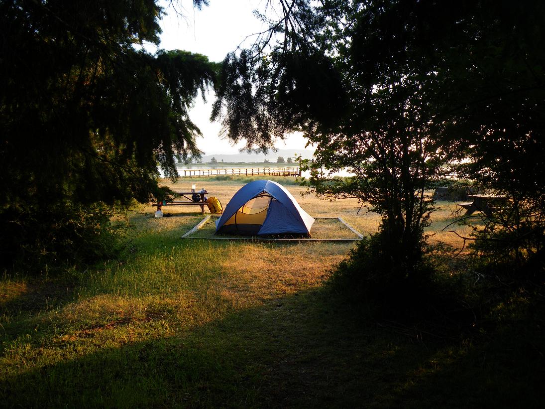 The cape is connected to Vancouver Island by a tombolo, positioning the campsites at Experiment Bight and Guise Bay approximately 500 meters apart by land but nearly 4 nautical miles by sea.