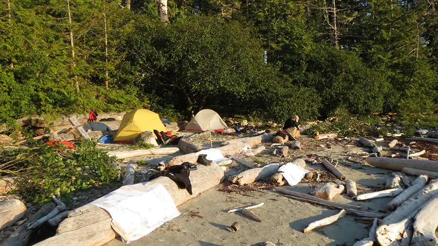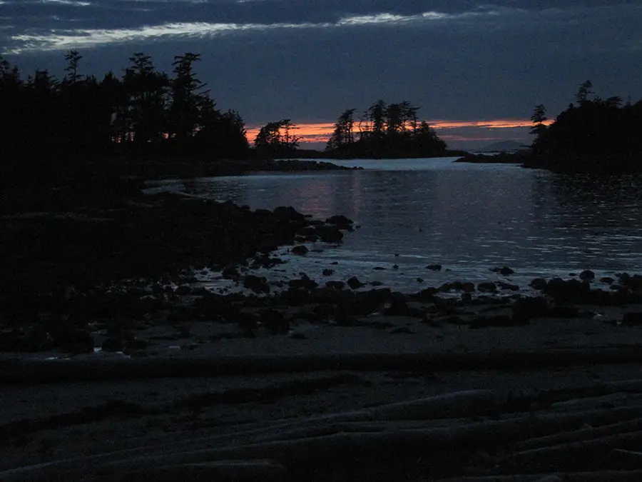 Dave, Greg and I were camped on the western shore of Price Island at the site called “P1” in the “West Coast Aristazabal, Price & Athlone Islands – Field Guide for Paddlers”. It’s a sizeable and protected beach that is choked with large drift logs and there are no openings into the forest that lines the top. We were expecting a 15.7 foot tide so camping on the sand was not an option. About 75 meters to the south and over many sharp rocks is a very camp-able area where we set up our tents. Not wanting to carry our boats across the rocks we left them the main beach.
