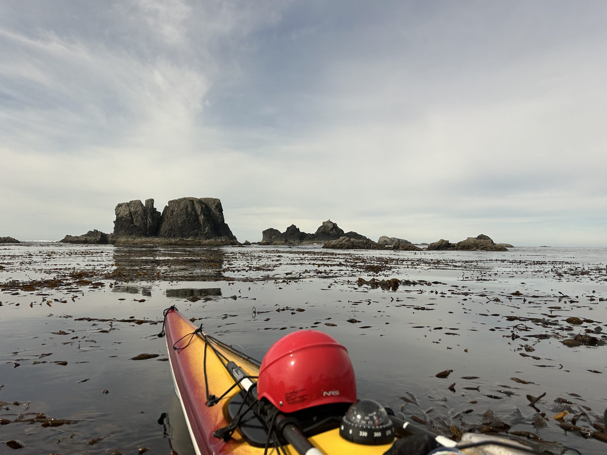 At 4:00 am on day 29, we reluctantly rolled out of our cozy tent, eager to get on the water at first light to avoid as much wind as possible. Essentially an 8 by 13-km rectangle sticking straight out into the open ocean, Brooks Peninsula is known for concentrating incoming wind and wave energy. Combined with its rugged shoreline that offers virtually no landing possibilities, this was the part of the trip we were most apprehensive about. After tearing down camp by headlamp and eating a starlit breakfast, we donned our dry suits, packed the boats, and were on the water by 5:45 am, as a pink sunrise lit up the sky. By 8 am, we rounded Cape Cook, the northwestern corner of the peninsula. Already, the wind was blowing at a consistent 20 knots, gusting to 25, and the sea was getting choppy. Luckily it was a tailwind, and, hoping that it wouldn’t pick up more, we paddled hard and flew down the outside of the peninsula, getting soaked by the 2-3 ft waves that splashed over our sterns and pushed us along. Luckily, the wind died down after that, and the rest of the day was uneventful. We continued to paddle well offshore, watching the waves crash against the exposed and beautiful coastline. At 1:30 pm, we arrived at our campsite. After 7.5 hours and 20.2 nautical miles (37 km) in the boats without a break, we were grateful to be back on solid land.