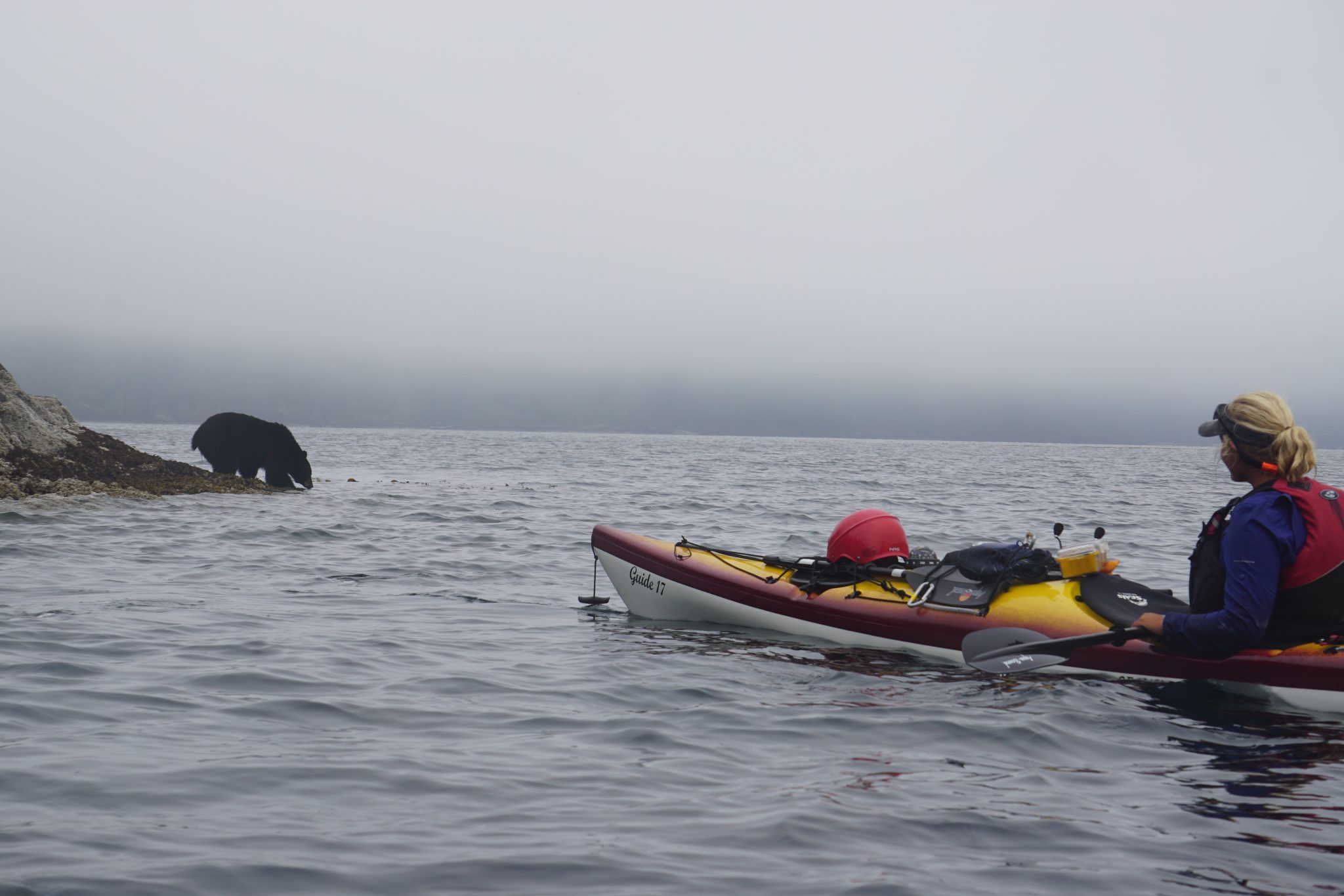 Setting off from Tofino, we were blessed with sunshine and tailwinds again, and we put in our longest day of the trip, paddling a full 26 nautical miles (48 km) to some islands near Ucluelet. From there, we crossed into the Broken Group Islands and spent a few days exploring. After not sharing any of our campsites since day 24, it felt odd to encounter other paddlers. There was even a family travelling on a motor-boat who pulled out massive tents, a barbecue, whole watermelons, coolers of chilled drinks, generators, and giant inflatable mattresses. We were most jealous of the mattresses, since ours had both popped beyond repair, and we had been sleeping on the ground since day 30. Our Broken Group highlight was snorkelling in a giant tide pool, complete with a full kelp forest and an eelgrass bed! After crossing to the Deer Group, we stopped in Bamfield to visit some people at the Bamfield Marine Sciences Centre, where Clara and I had studied for the fall semester last year. The next morning, we woke to a mama bear and her two small cubs up a tree less than 10 m from our camp, and slowly moved our things down the beach to get out of her way.