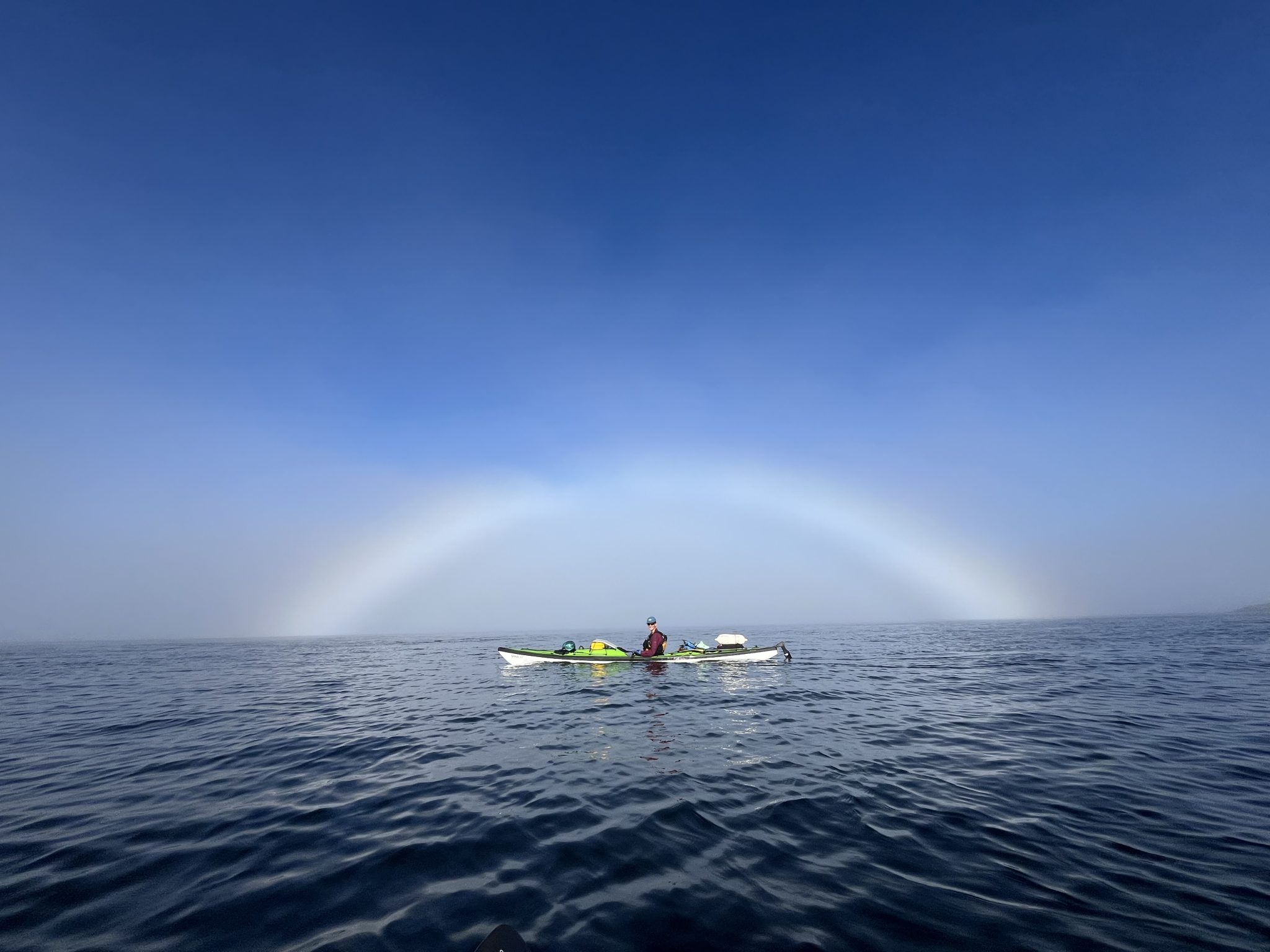Finally, on day 17 we entered the Broughton Archipelago on a magically calm, foggy morning. We were immediately greeted by the sound of humpback whales breathing all around us. We were elated to see whales breaching and sea lions playing in the strong currents that make these islands so abundant in life. We enjoyed a much-needed rest day in the Broughtons, with a day trip to explore some of the islands (in speedy empty kayaks!), and caught fresh fish for dinner.