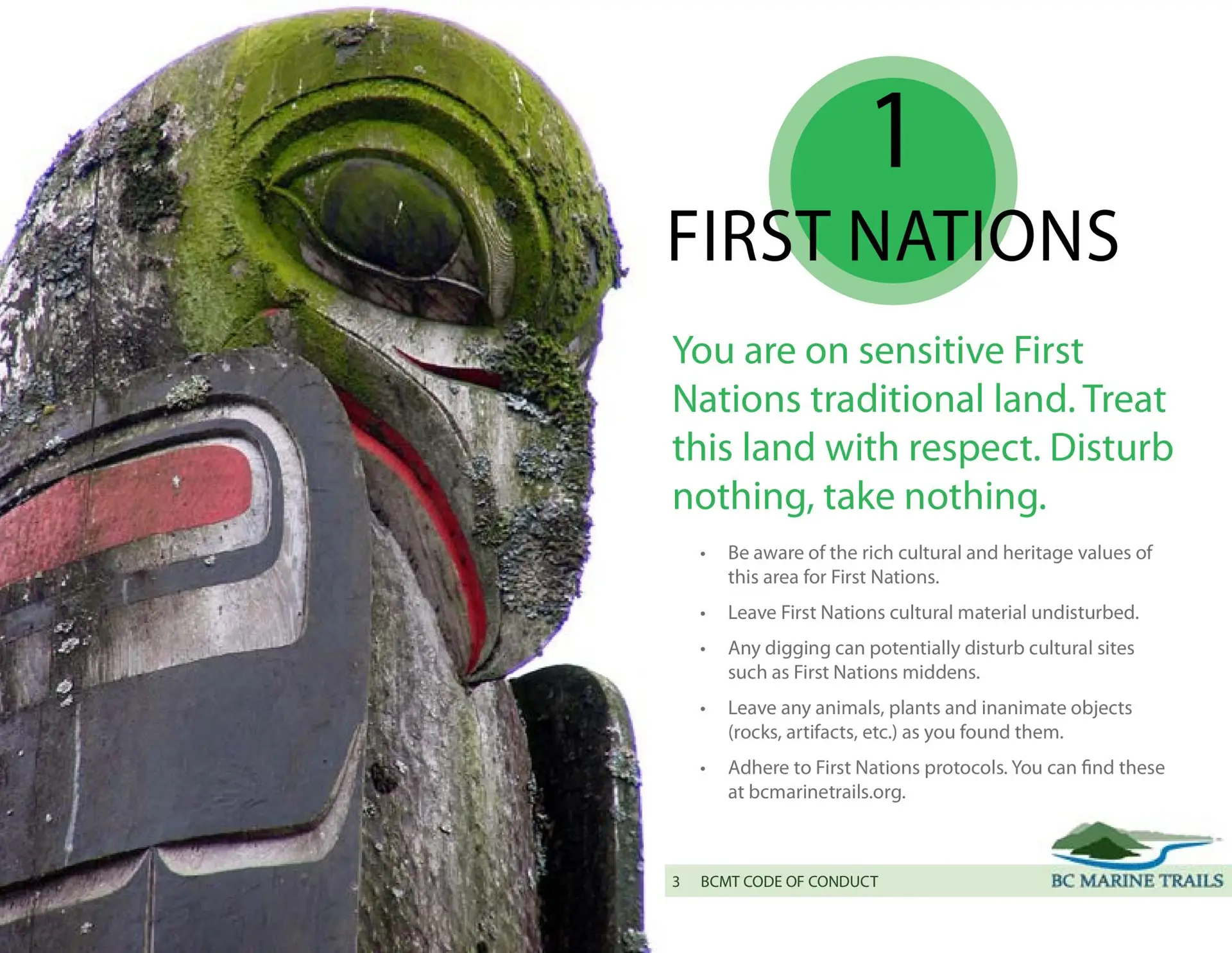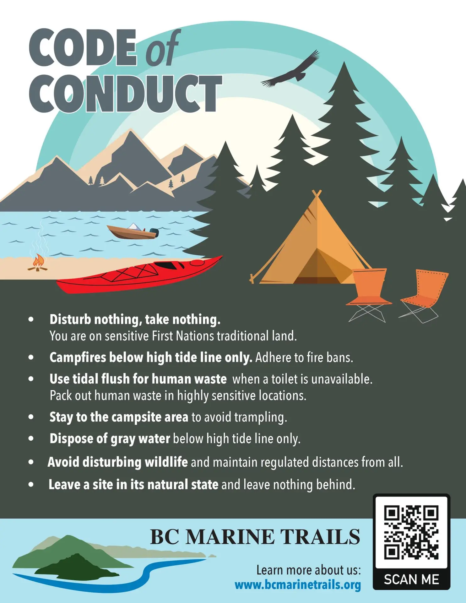 BC Marine Trails (BCMT) wants to ensure minimal environmental impact by users at marine trail sites. Because sites are so widely dispersed and cannot have direct oversight, it is incumbent upon users to practice habits and behaviours that achieve minimal impact. By following the elements of this Code of Conduct, users can be assured their use of marine trail sites will lead to minimal environmental degradation.