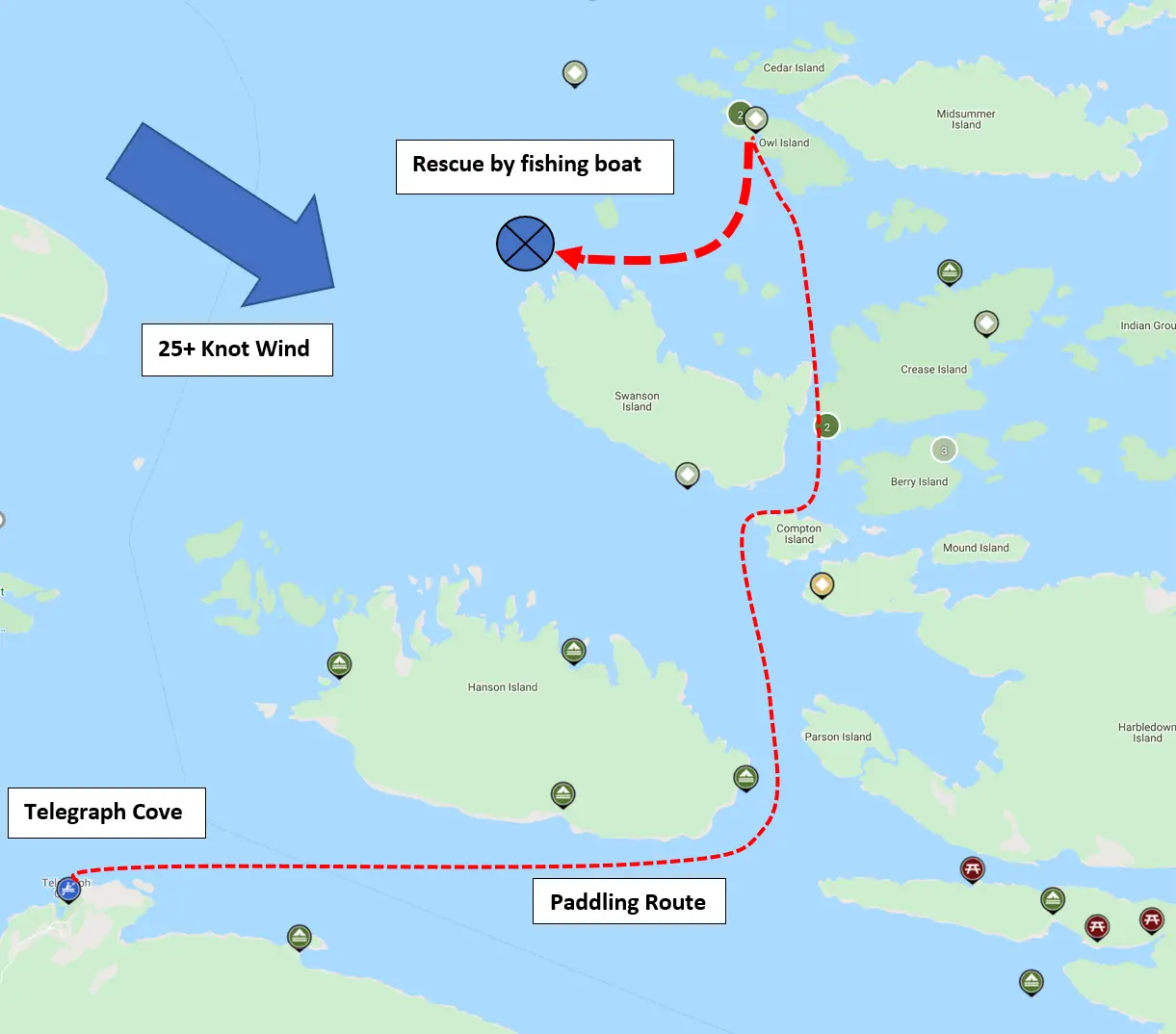 That’s what I’d told Julee’s father, and yet nine years earlier, I had nearly killed my former partner in conditions similar to today on a return paddle to Telegraph Cove. Like today, the wind that day had been light when we set out in the morning. By afternoon, a 25+ knot northwesterly created breaking seas and reflected waves neither of us could make progress against in our single kayaks. Seeing our distress, a passing fishing boat—the Princess Cherie—had rescued us.