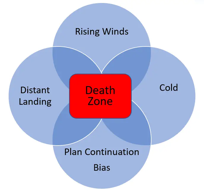 Paddling risks overlap, like in a Venn Diagram, to form a Death Zone similar to the one above 8000 meters on Mount Everest. The book More Deep Trouble: More True Stories and Their Lessons From Sea Kayaker magazine contains 29 chapter-length stories about sea kayaking mishaps. Many of the stories occur in paddling conditions similar to the ones Julee and I experienced crossing to McMullan Island, many involve overlapping risks, and many result in death.