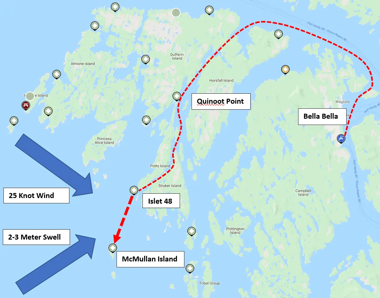 What to do? What to do? We can’t paddle sideways, into the wind and head for Japan. We can’t paddle back to Islet 48 as the wind, current and breaking seas coming from behind are too strong. And we can’t surf downwind straight for the McMullans as the bow of the kayak will dig, we’ll broach sideways, and waves will flip us over like a rag doll. I know this for certain because I’d done it many times while kayak surfing.