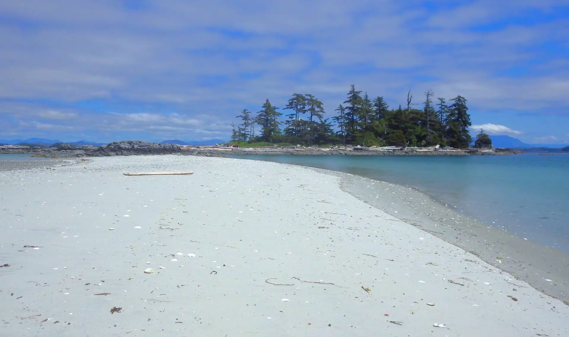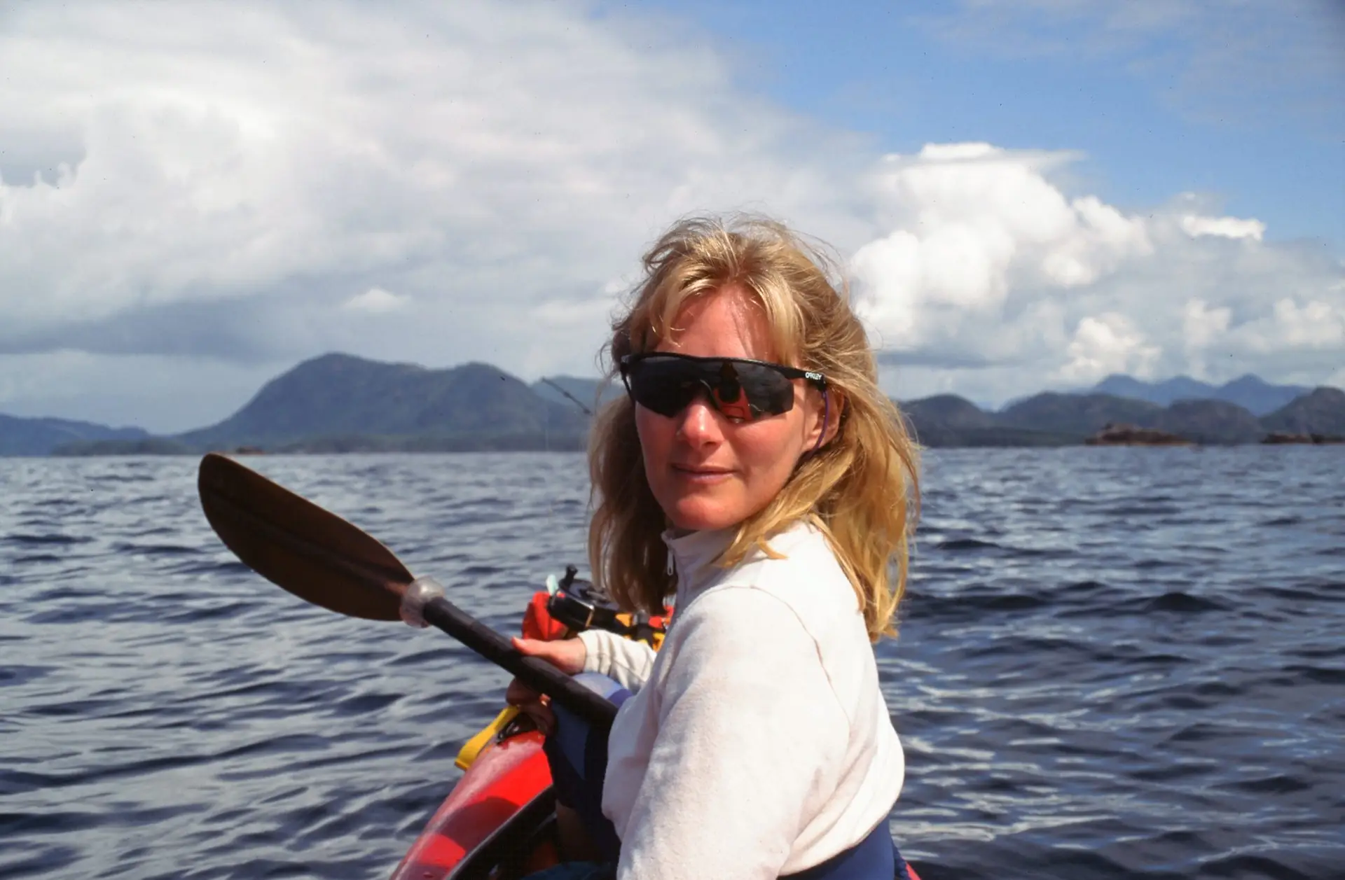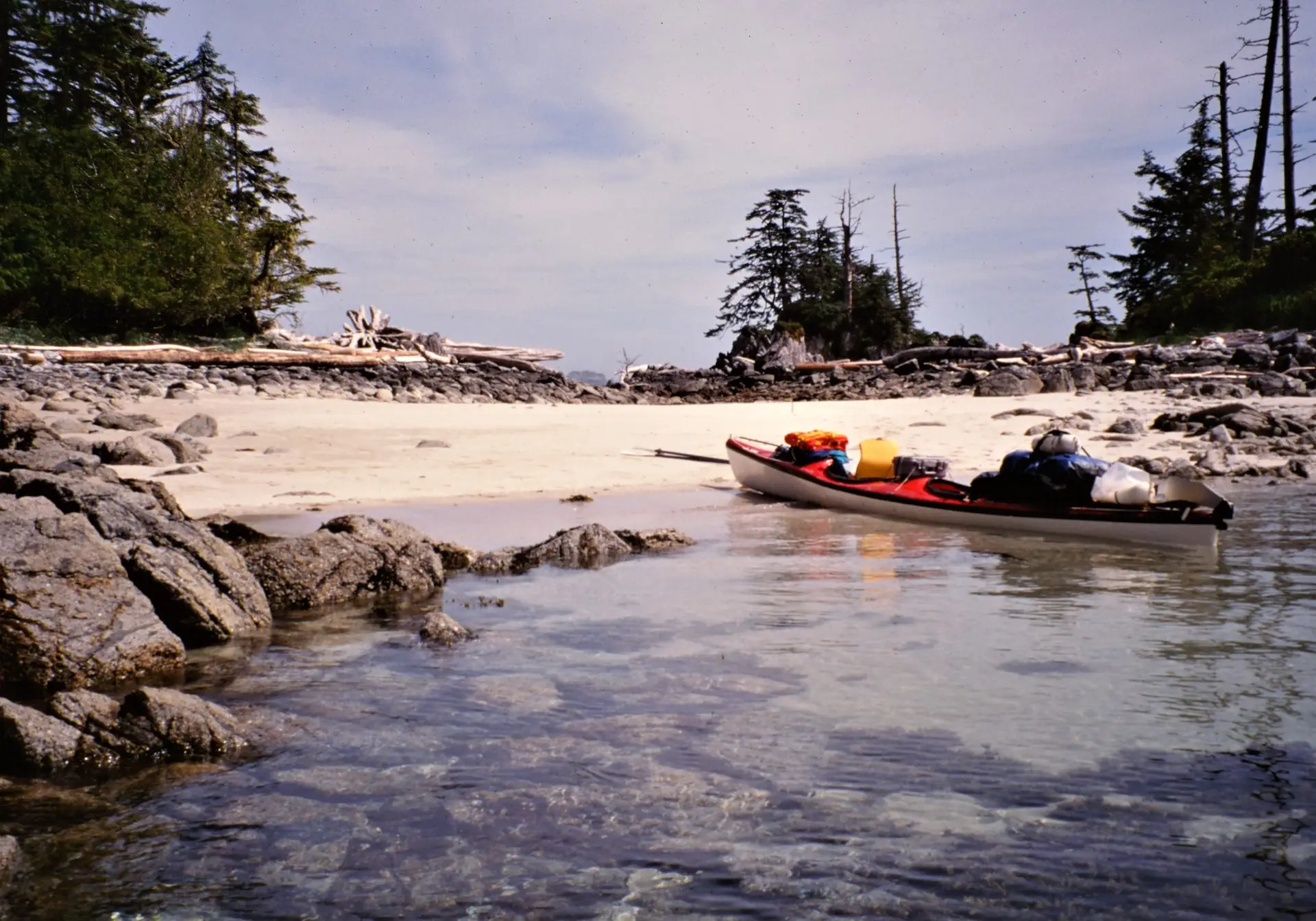“Paddle on or stay here?” I ask my girlfriend Julee. It’s day 2 of our planned 600-kilometer kayak odyssey down the outer coast of British Columbia. We’ve paddled 37 kilometers down narrow tree-lined channels to reach the open coast at Islet 48 and we’re peering through binoculars at the 5-km crossing to today’s intended destination, McMullan Island. In the mid-July sun, the beach and protected cove here have a mellow vibe. There is barely a ripple on the water, but a stirring in the treetops hints of afternoon thermal winds starting to fill in. Two other kayakers have set up camp down the beach. They’re leaning against a log and take a break from their reading to give us a friendly wave. Too crowded, I think. I want to be alone with my girlfriend.