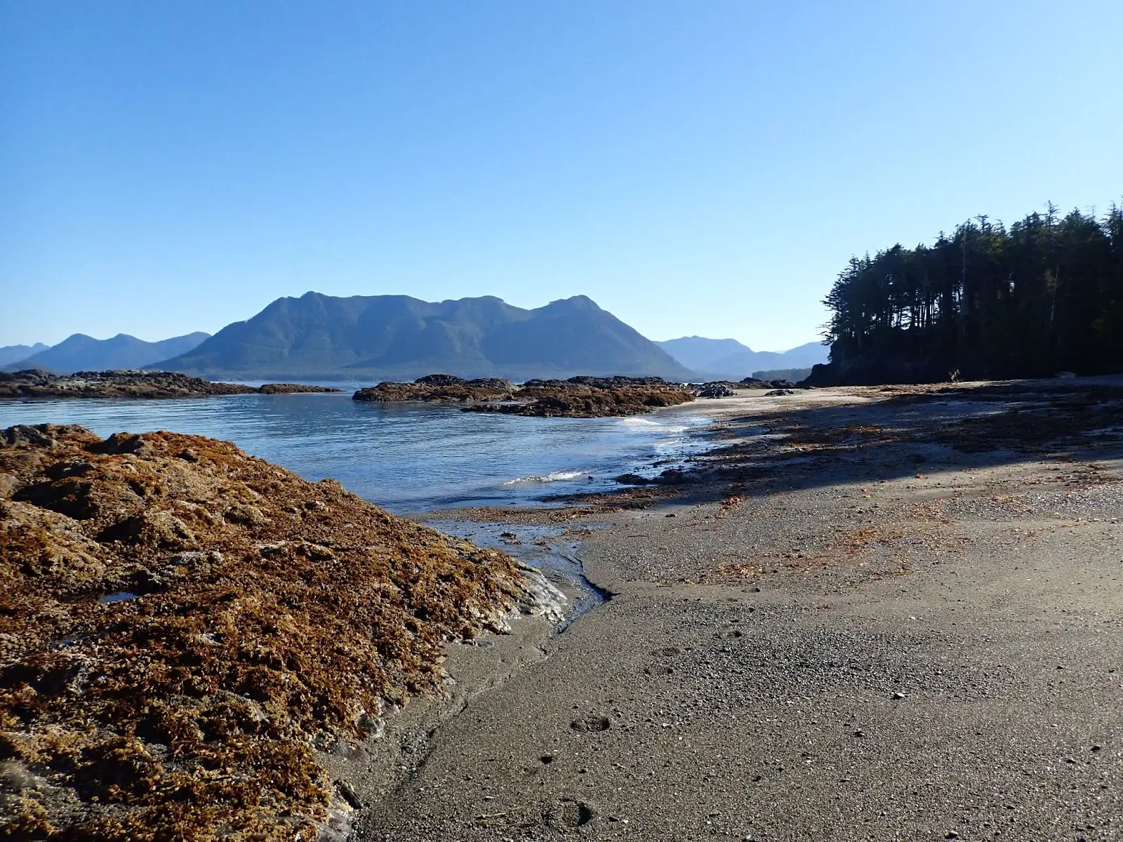 My husband Eric and I completed a nine-day kayak trip in the Nuchatlitz Group in August 2023, and we had a favourite day on this trip. After weathering strong and gale-force winds and three to four metre swells for the first few days, finally a break in the weather allowed a crossing of the Nuchatlitz Inlet for a day of exploration. The forecast on the VHF radio for this day trip was low wind and swell for West Coast Vancouver Island South, so it was time for extended touring from our base camp.