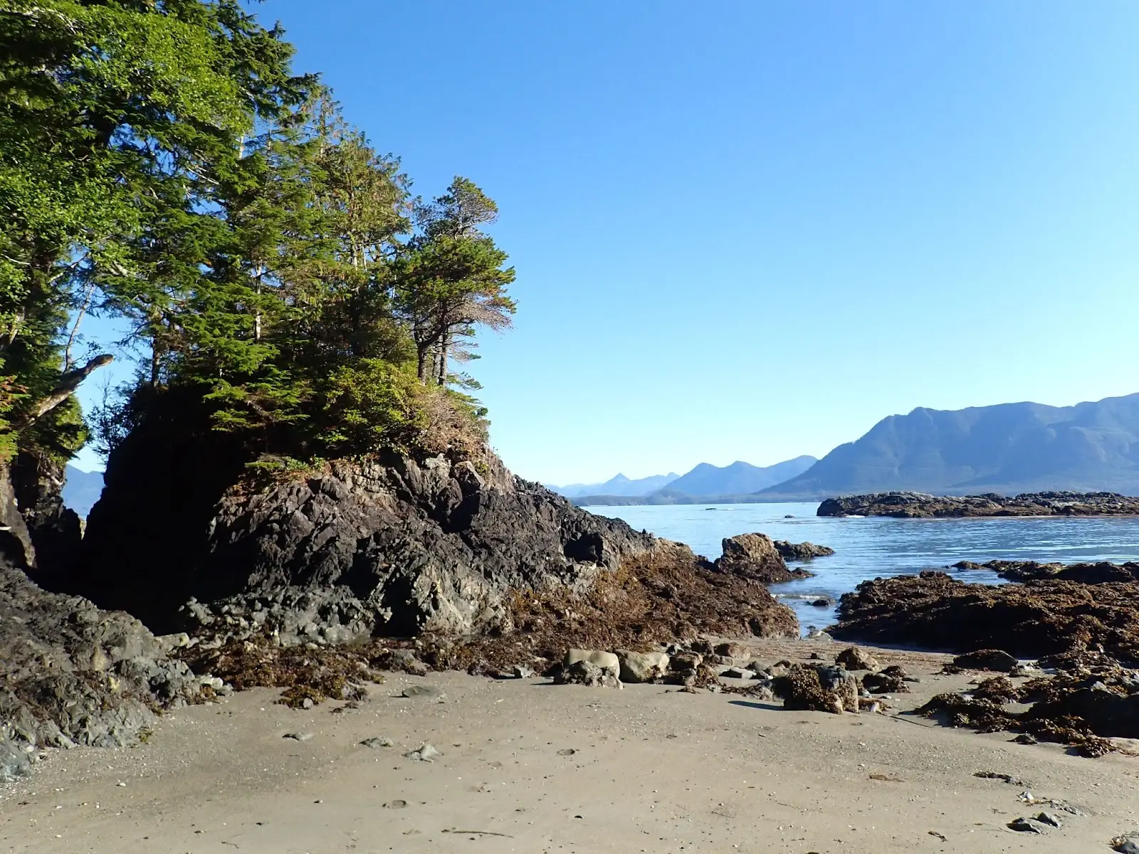 My husband Eric and I completed a nine-day kayak trip in the Nuchatlitz Group in August 2023, and we had a favourite day on this trip. After weathering strong and gale-force winds and three to four metre swells for the first few days, finally a break in the weather allowed a crossing of the Nuchatlitz Inlet for a day of exploration. The forecast on the VHF radio for this day trip was low wind and swell for West Coast Vancouver Island South, so it was time for extended touring from our base camp.