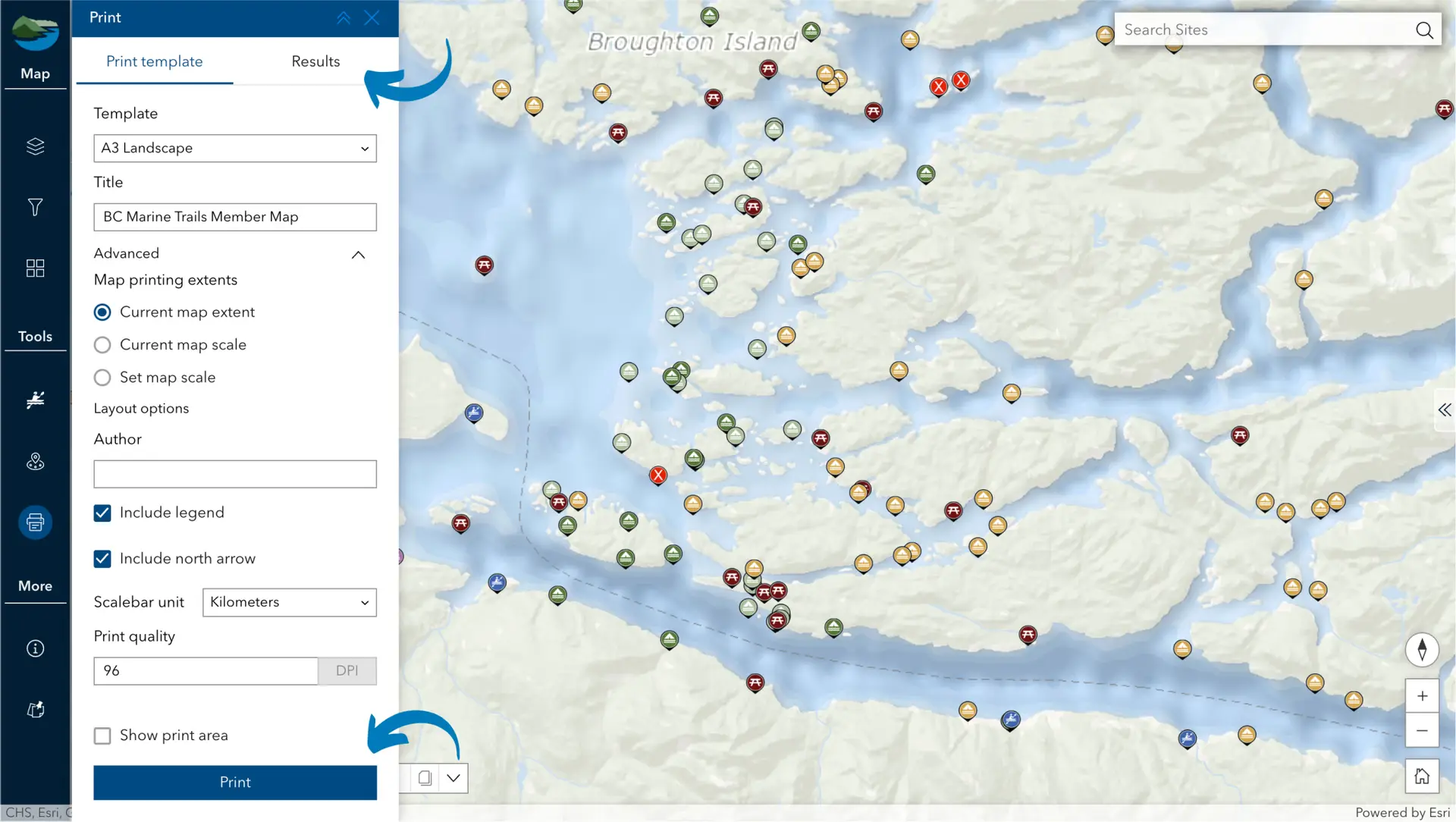 Easily print discrete sections of the map to bring with you in the field! Choose from a variety of features to be shown on your PDF, then click ‘Print’. Your download will then be ready under the ‘Results’ tab on the top bar. Due to system limitations, scale bar units cannot show Nm.