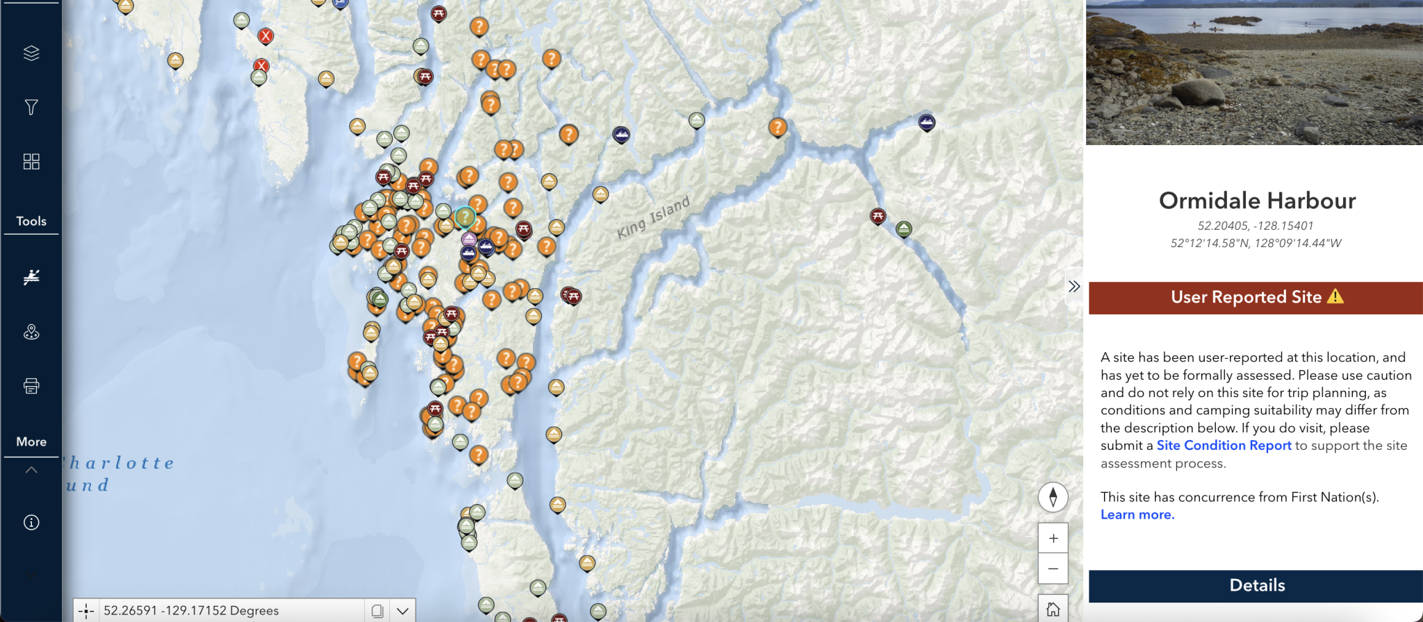 If you visit a reported site, please submit a Site Condition Report. Your observations help BCMT and the Heiltsuk Nation evaluate these sites and provide better info to others.