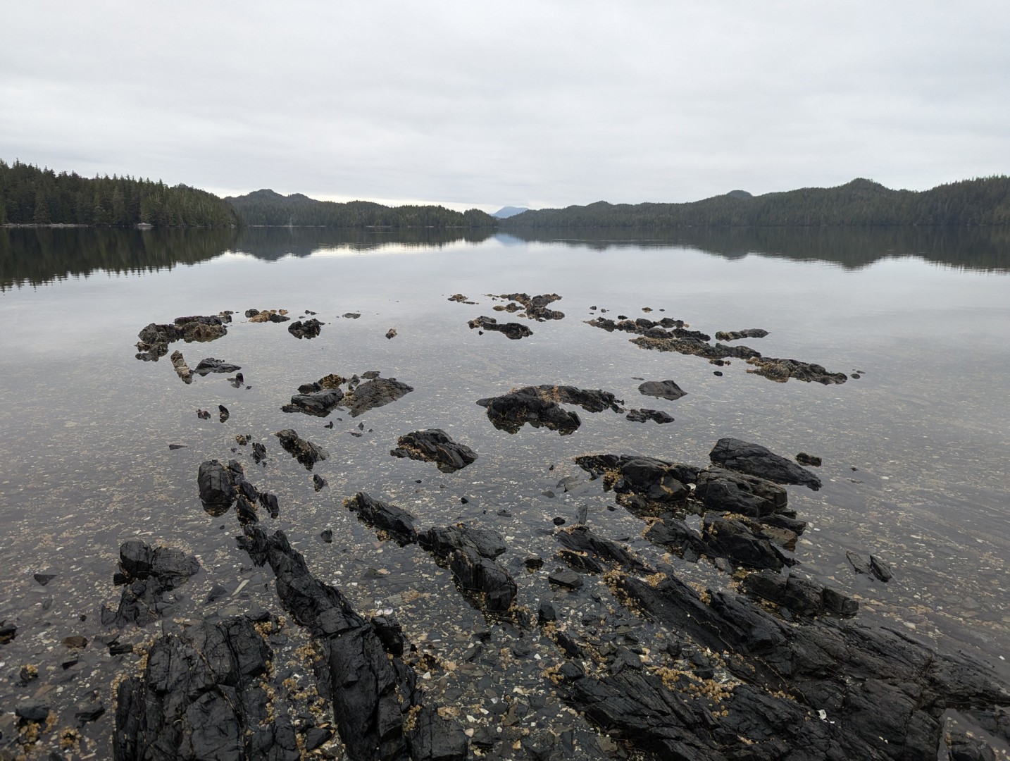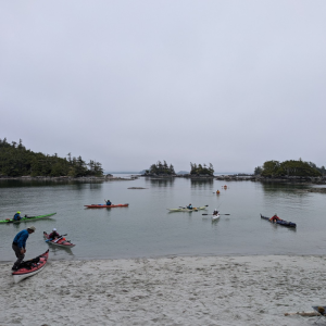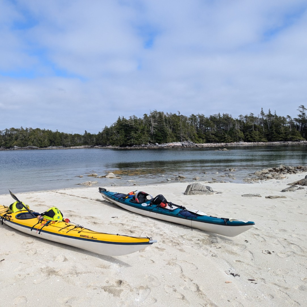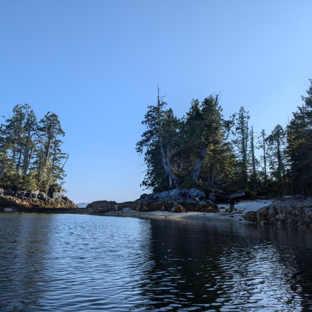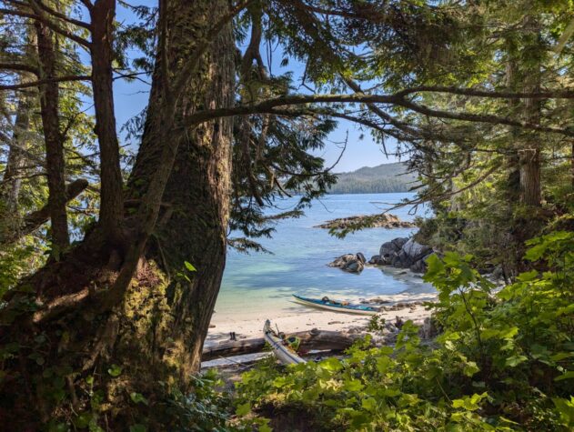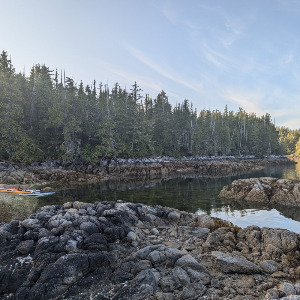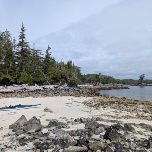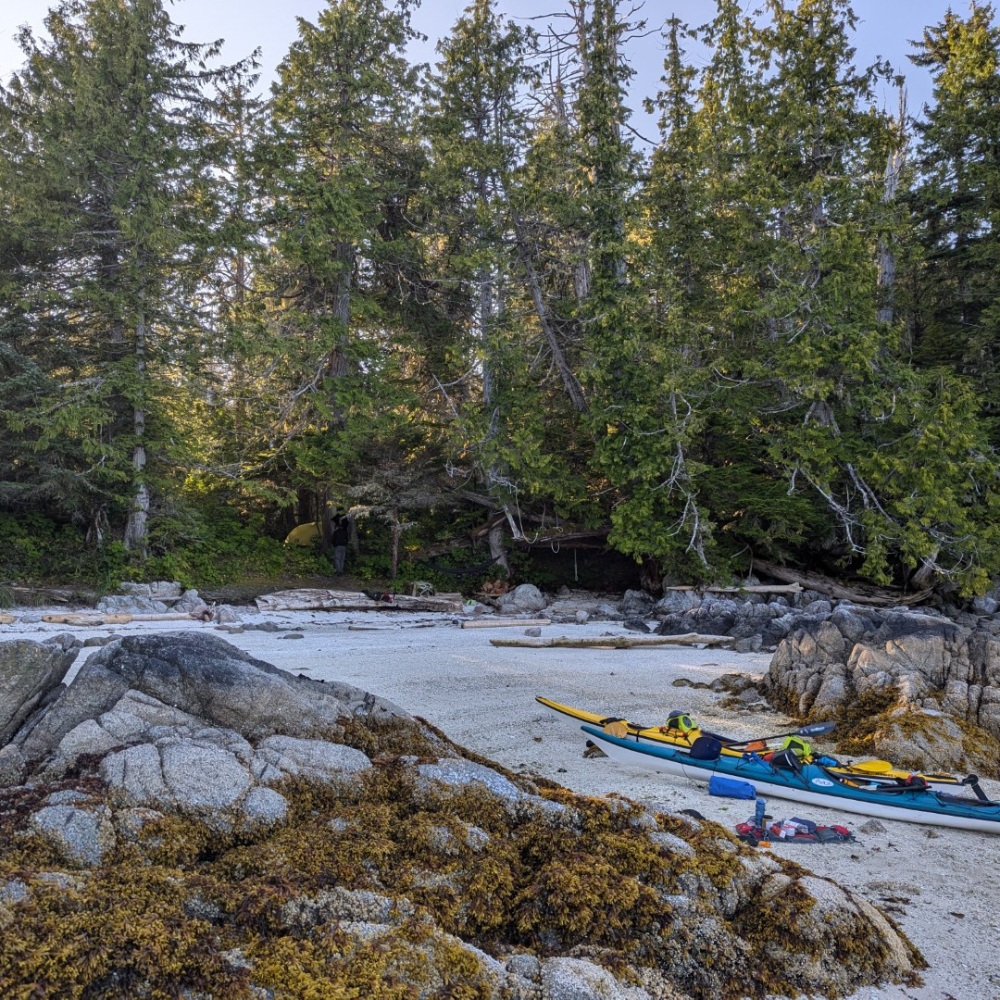 We officially launched our kayaks from McLoughlin Bay where the BC Ferry docks, just south of Bella Bella. Kayaks and gear are unloaded from the ferry, we pack the boats, and begin the paddle heading south down Hunter Channel, aiming for Solesby Island. Day one was a “trial by fire” 17km paddle after a long day of ferry travel and (un)loading. However, the conditions were flawless with clear skies, light winds, and beautiful sights ending at a stunning shell beach campsite where we setup camp.