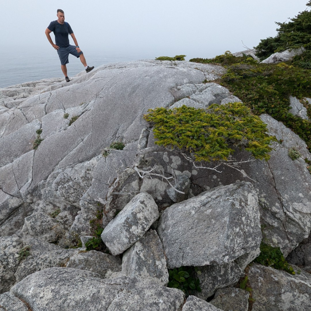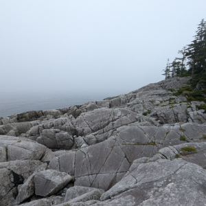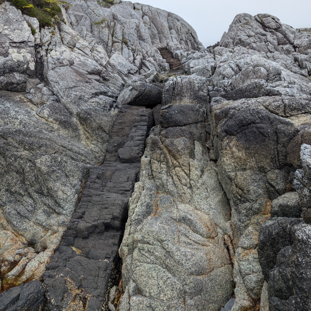 We explored the beach here and crossed the island to explore a neighboring island that was accessible at low tide. Here we found a massive granite cliff facing the west coast. The rock was remarkable and contained paths and staircases of dark stepped bands of rock cutting through the lighter granite which we believe to be basalt. We explored the island before returning for rest and sleep. Shawn made a cast iron pizza that was shared and my mind was blown at enjoying such a treat out here in the wild.