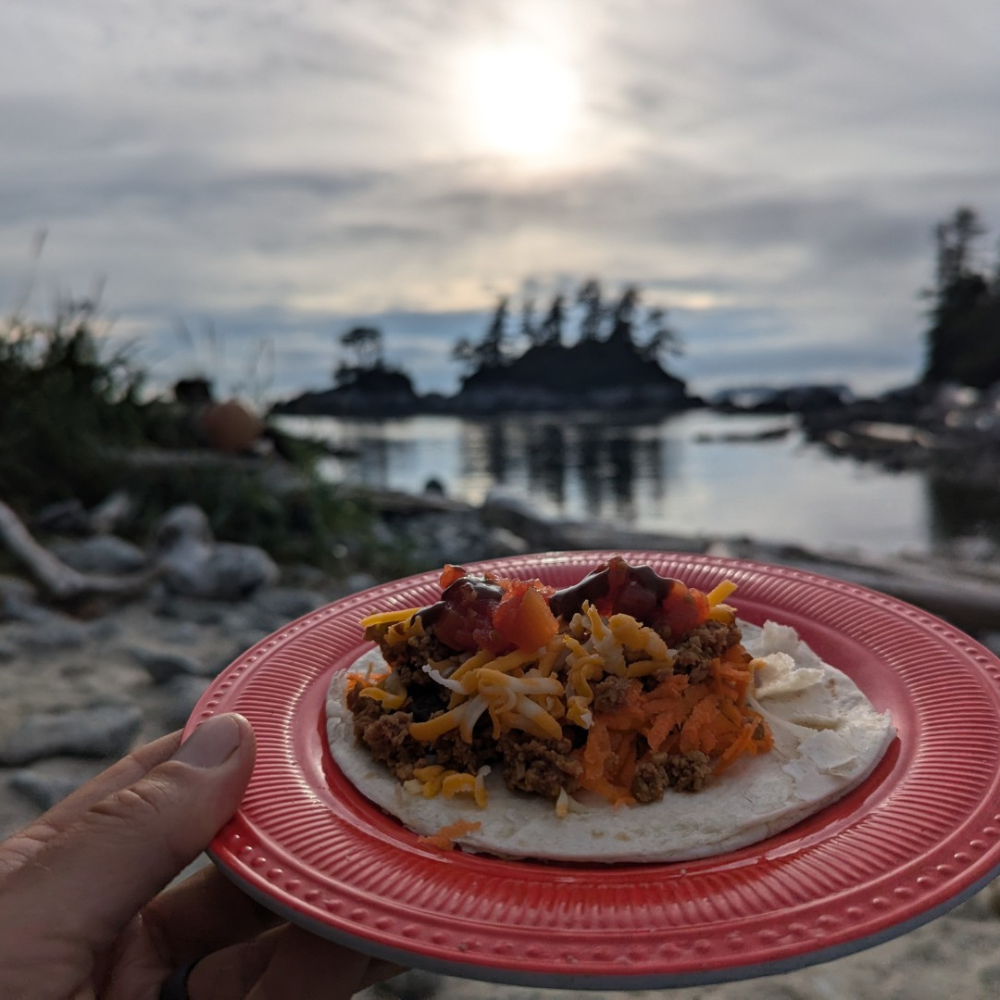 Another mind blowing meal as we put together tacos collectively with avo, cheese, black beans, and dehydrated vegetable protein bits.