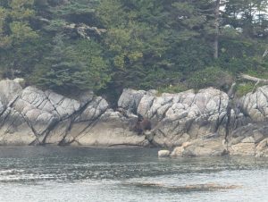 We marveled and laughed at the experience of seeing the grizzly bears and counted ourselves very lucky to have seen them in the wild. I can only imagine what motivated them to swim way out to the McMullin Group of Islands. It had to be more than just the sweet salal berries, perhaps they were being stalked by a male grizzly? Perhaps that male was in the area too?! In any case we were able to let out a sign of relief that we had left them 7 kilometres behind.