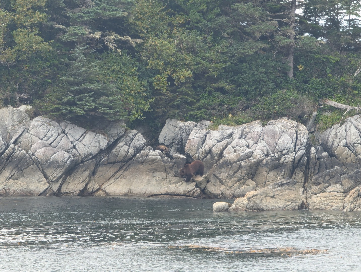 It was the last thing I expected to see on this tiny group of outer islands. Seeing a grizzly in the wild is humbling; seeing one with a cub on a small island is electrifying and potentially very dangerous. I scrambled up onto a rock to gain height, turning back, I watching as they bolted in the opposite direction. The encounter shook me and Shawn was in disbelief until I showed him the photo I captured as they ran away. The hump on the mother’s back is a clear marker of a grizzly bear.