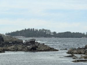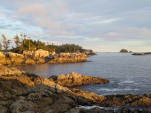 As we turned away from the wild west coast, and back toward the mainland inlets, the environment changed. The “outside” coast’s drama gave way to the “inside” silence. At the Helsik Cabin at Quinoot Point, the water was as still as a lake. We watched as the sunset moved across the trees while a large family of river otters played in the nearby current. The somber, eerie calls of birds echoed through the sound.