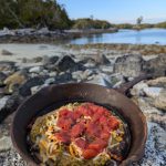 The following day we enjoyed another cast iron creation (thanks, Shawn). I collected fresh water, warmed in my jet boil, and used a modified dry bag with a spout to have a shower against the root of a giant fallen tree. Not the best shower I have experienced, but certainly the wildest.