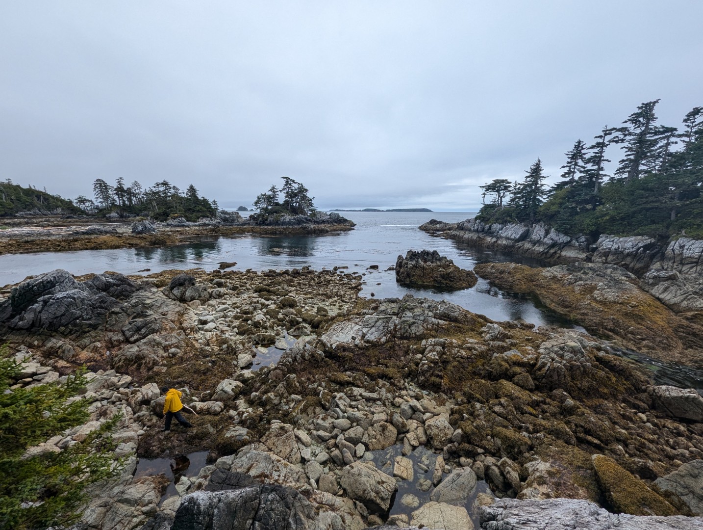 We decided to return to the small island west of us at low tide and circumnavigate via the shoreline. There was much to explore here with the white rock ridges, black basalt lava belts, and heather and stunted trees clinging to the cliffs.