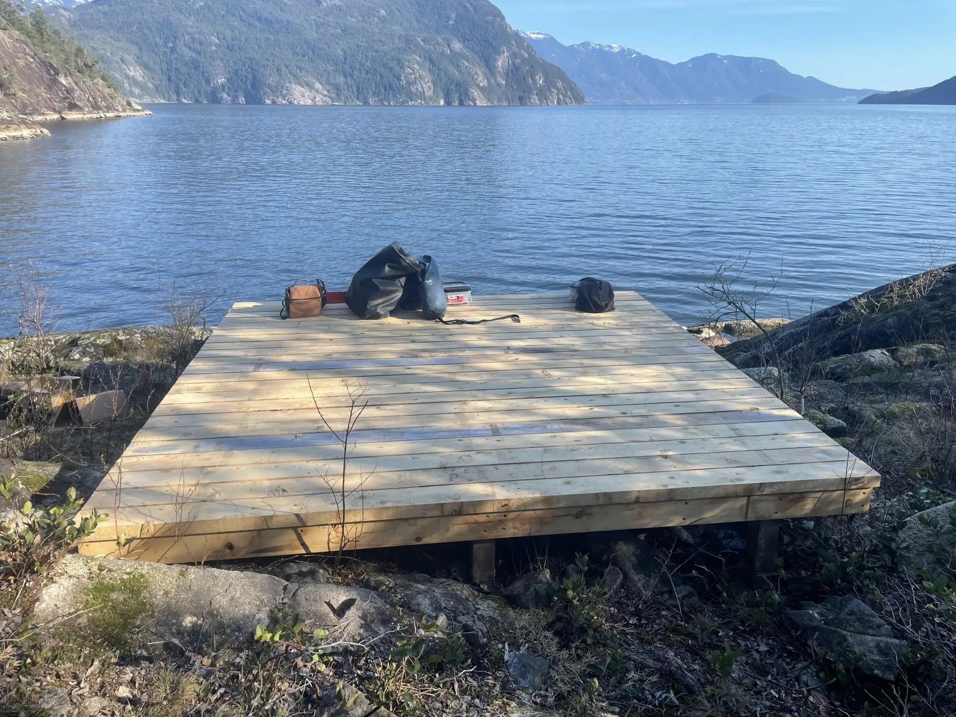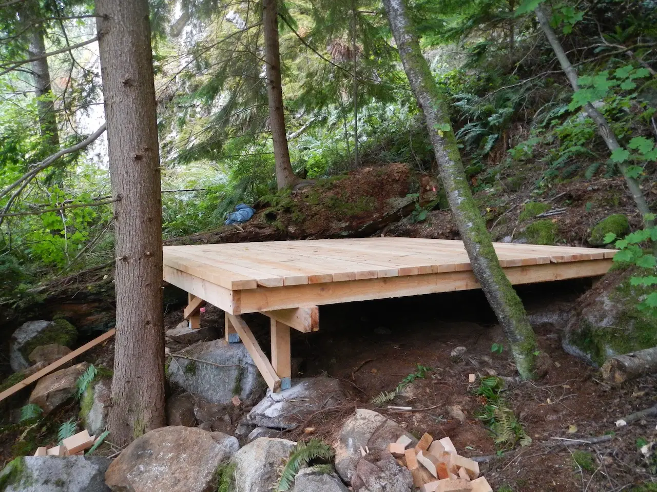 In the spring and fall of 2024, new tent platforms, tables, and bear caches were installed jointly between BCMT, SKABC, and RSTBC at multiple sites along the trail.