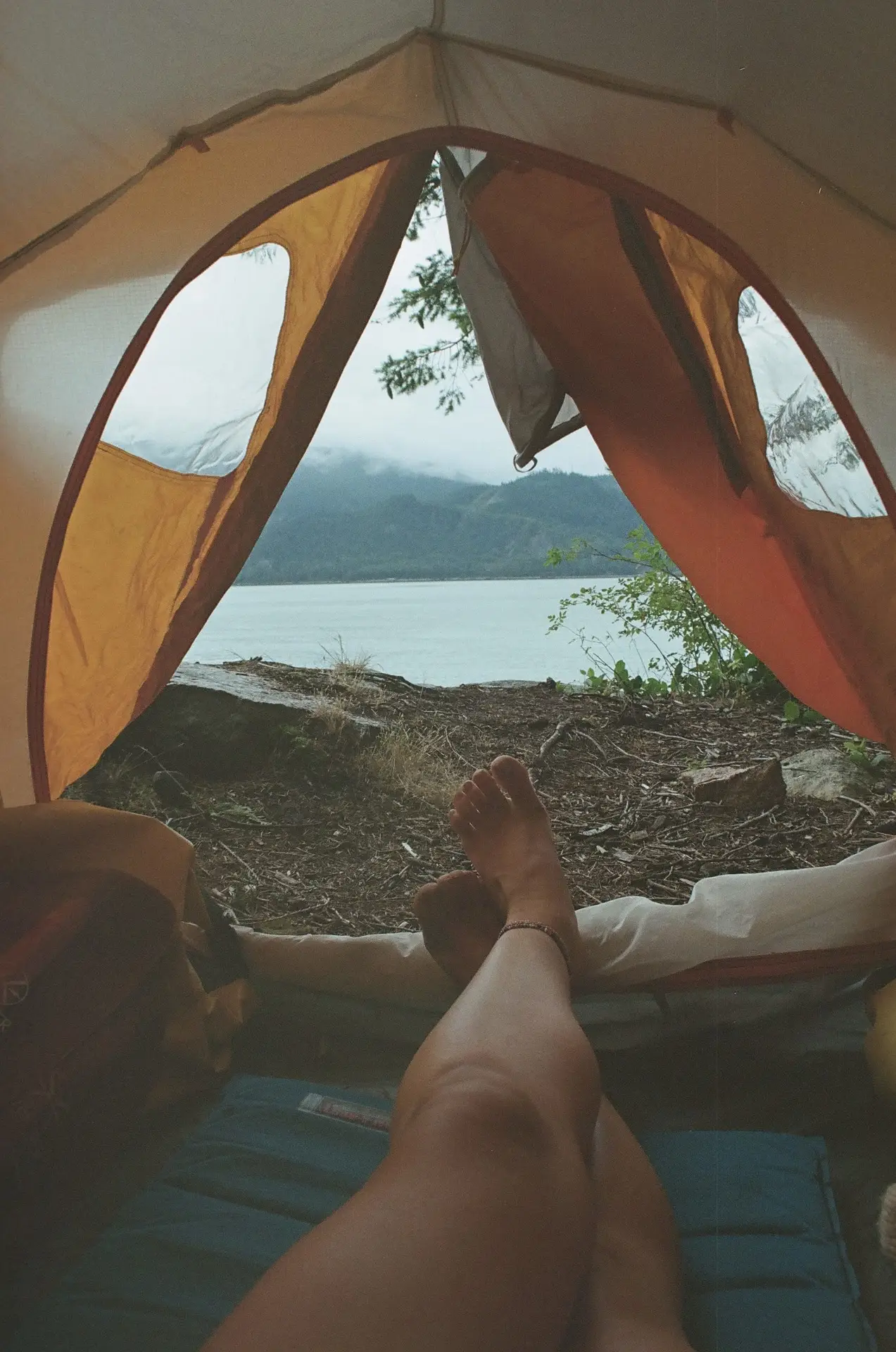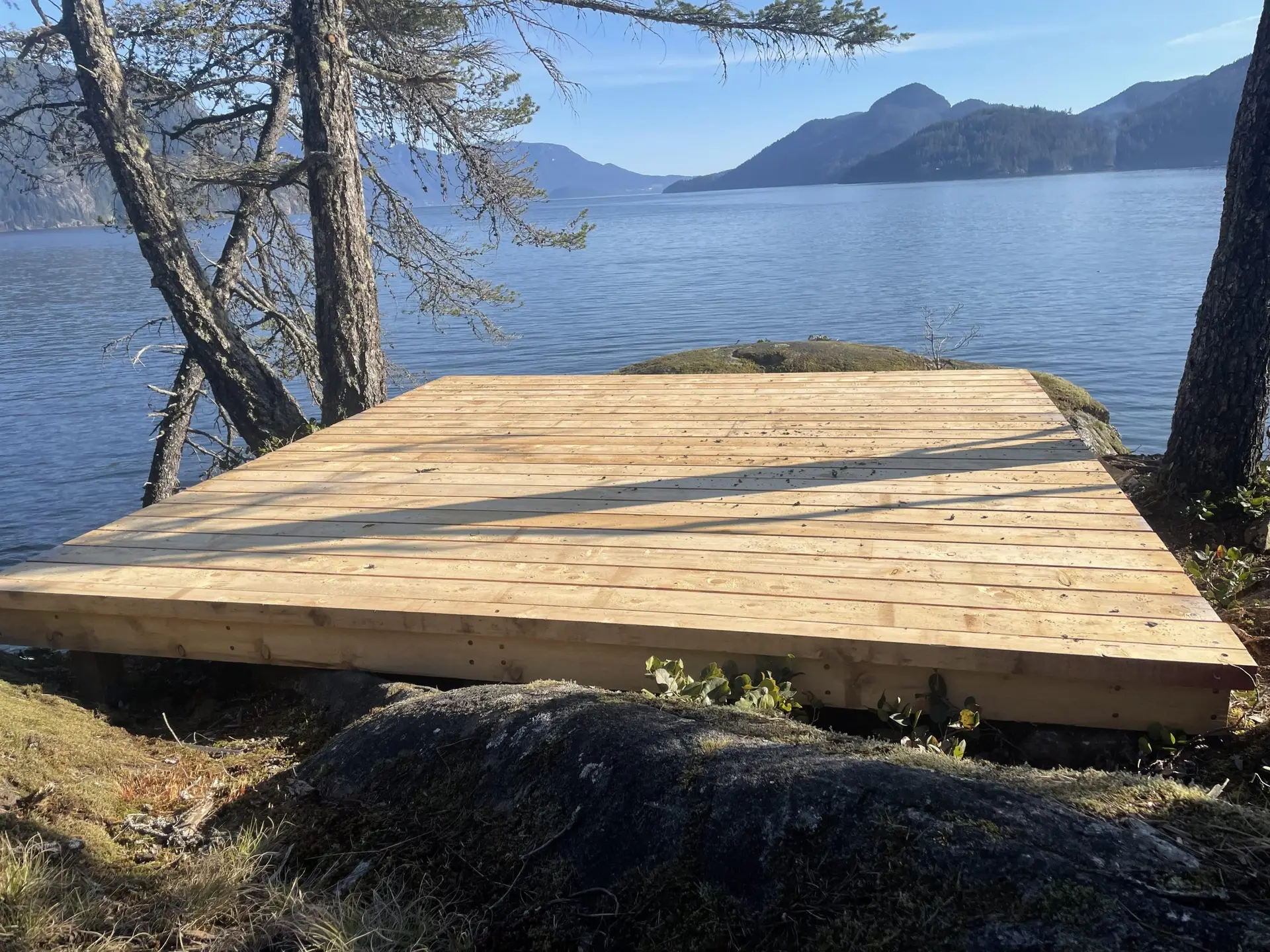 Back down at the waterfront, at the north end of the beach a trail leads past another tent platform, along the north shore of the bay, up a wooden stair, to a little benchland with two tent platforms and great views.