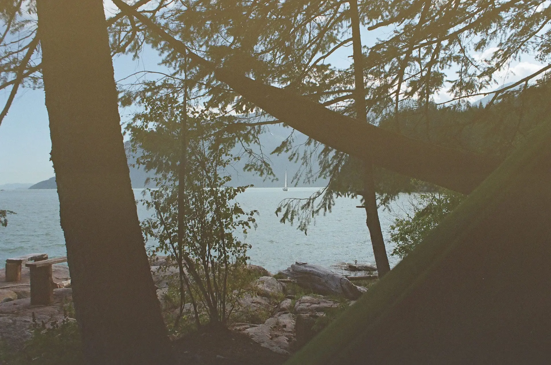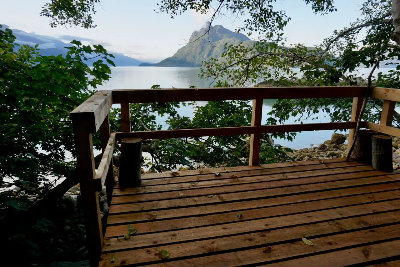 Five kilometers north of Bain Creek along the west side of Howe Sound is the south-facing Thornbrough Channel Recreation Site. A cleared boat runs through the rocky beach to a trail through the forest. There is an aluminum bear-proof food cache just below the trail and two levelled tent pads just above the trail. Past the second tent pad, a side trail switchbacks up the steep hillside to a composting toilet. Back on the main trail, there is a second food cache just before a log bridge over a small creek. Again, the creek is a good water source for most of the year, although it will run dry in a prolonged drought. Past the creek, another side trail leads off to the left and emerges on an open rock slope, with three tent platforms and a picnic table scattered among the rocks and trees. The main trail carries on up the steep hillside, coming out on a high rock bluff, with one tent platform,