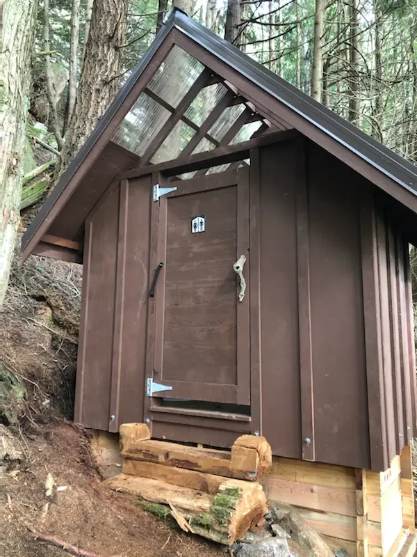 East of the creek and before the clearing, a side trail leads up the hill past a tent platform just above the main trail. Farther up, one direction leads to the composting toilet. The other direction leads up the creek, where two tent platforms are perched right on the side of the creek, and you fall asleep to the sound of rushing water close by.