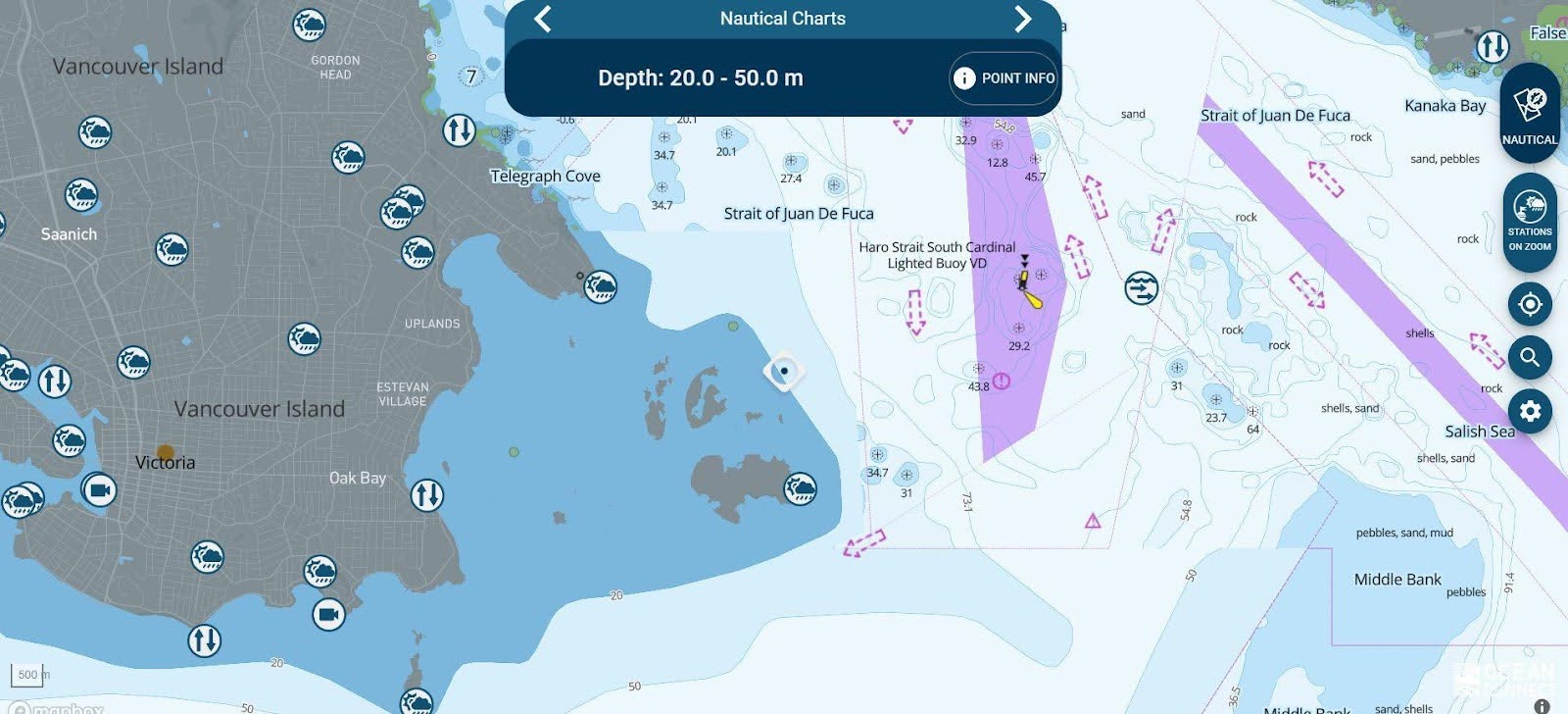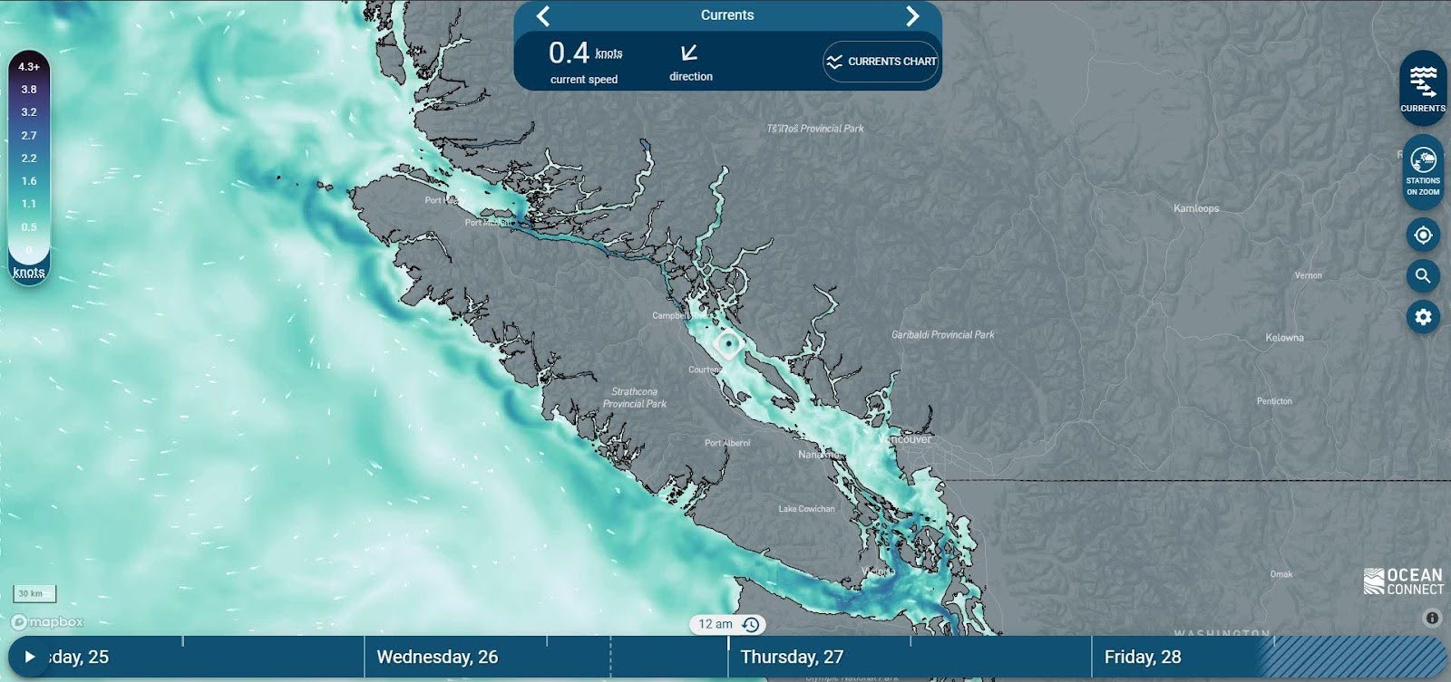 The current issue with OceanConnect is resolution. It does not take in islands less than 500m and it often can’t figure out currents in extreme narrows, like Gale Passage in Bella Bella, where it essentially breaks down. So when using OceanConnect, use it as an aid, and never take tech as the bible. A couple other downsides: the colour scheme makes it look like it’s snowing :), and it’s not very accessible offline.